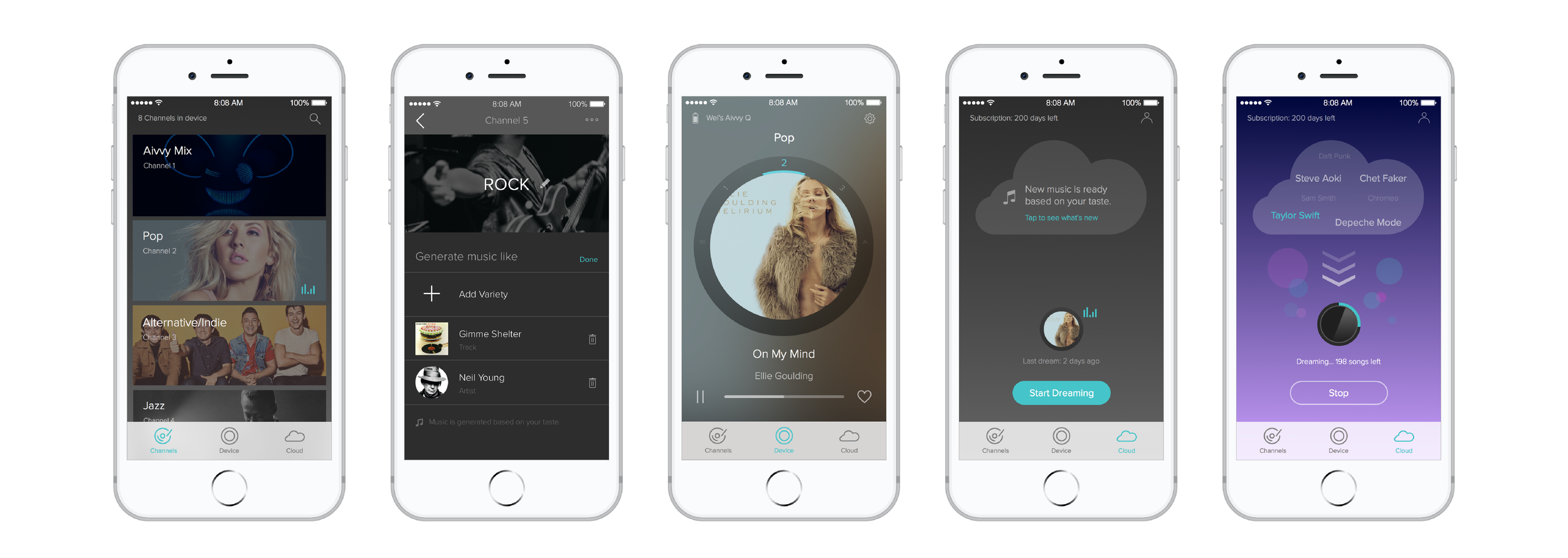 Through your actions (tap, swipe, turn), Aivvy learns your musical preferences.